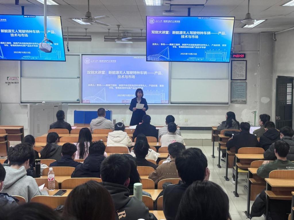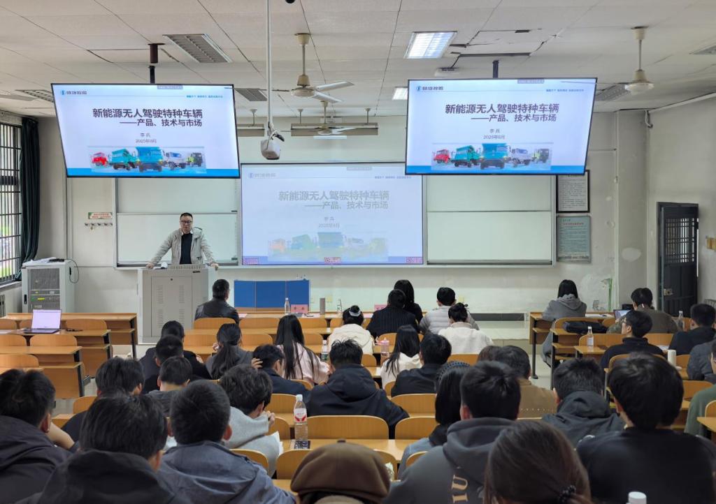 李兵长期深耕大吨位车辆研发、新能源技术应用及无人驾驶系统突破,拥有丰富的行业实战经验。讲座中,他以“产品-技术-市场”为核心脉络,系统解读新能源无人驾驶特种车辆的产品定位与技术特性,深入剖析核心技术的突破路径与行业发展现状,结合自身参与的实际研发项目与行业典型案例,生动呈现该领域技术在新疆、内蒙古等地区的落地场景与市场发展前景,并针对硕士研究生阶段的学习提出具体建议。详实的内容与鲜活的案例,让学生对该领域形成更直观、深入的认知。