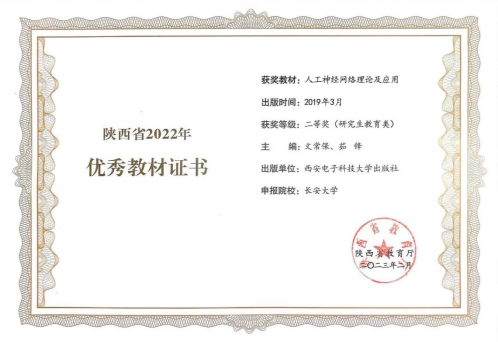日前,根据陕西省教育厅办公室《关于开展陕西省2022年职业教育和高等教育优秀教材奖评选工作的通知》,省教育厅组织专家对各单位申报的优秀教材进行了评审,买球官网文常保教授、茹锋教授主编的《人工神经网络理论及应用》教材获得陕西省2022年高等教育优秀教材二等奖(研究生教育类)。