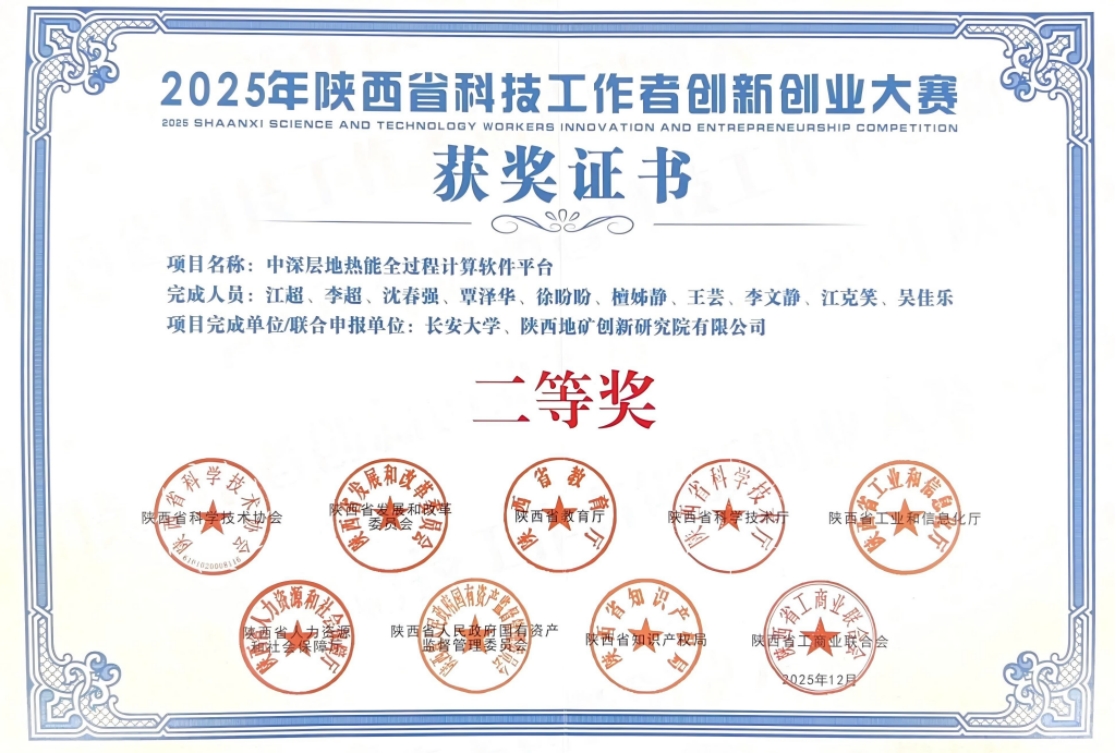 2025年11月,陕西省科技工作者创新创业大赛在西安举办。买球官方网站青年教师李超作为第二参与人,与建筑工程学院江超老师主持完成的《中深层地热能全过程计算软件平台》荣获二等奖。