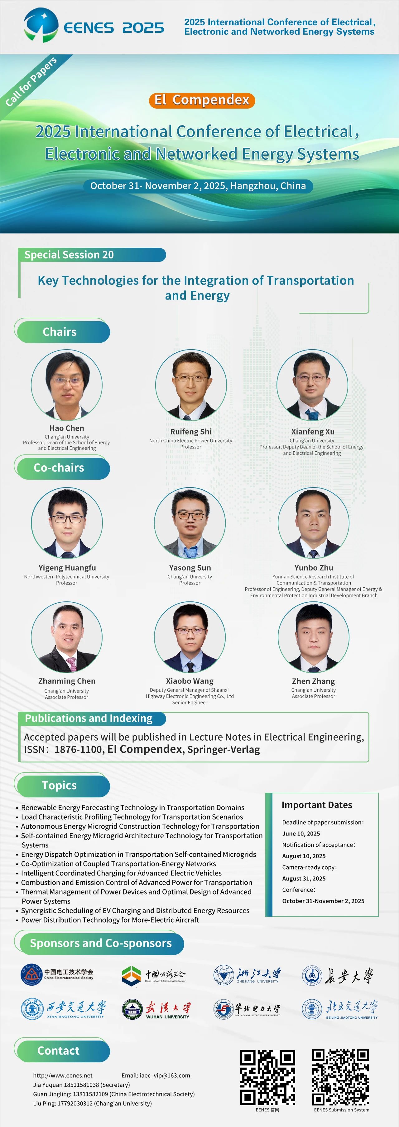 由中国电工技术学会、中国公路学会共同主办的2025年电气电子与网联化能源系统国际学术会议(EENES 2025)将于10月31日至11月2日在风景秀丽的杭州盛大召开。本次盛会由浙江大学、买球官方网站、西安交通大学、武汉大学、华北电力大学及北京交通大学共同承办。