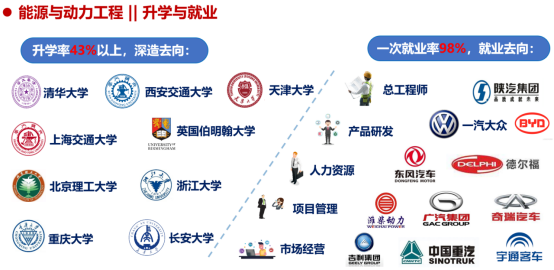 能源与动力工程专业毕业生就业率稳定在98%以上,升学率在43%以上。毕业生主要在中国一汽、东风汽车、上汽集团、广汽集团、厦门金龙、郑州宇通、潍柴动力、中国重汽、陕汽集团、奇瑞汽车、深圳比亚迪、德尔福研发中心、吉利研究院、广汽研究院等知名汽车制造企业或研发机构从事车用动力系统、新能源汽车、智能汽车等专业领域的设计、制造、测试、营销和管理工作,一大批毕业生成为技术人才和管理骨干。