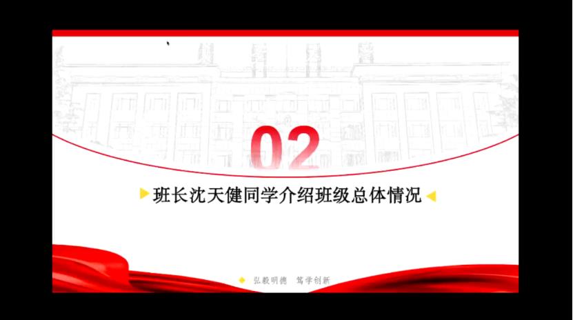班长沈天健同学介绍了本班的总体人员组成和班委分工情况,并且围绕文明班集体建设介绍了班级德育+智育+体育的发展目标。