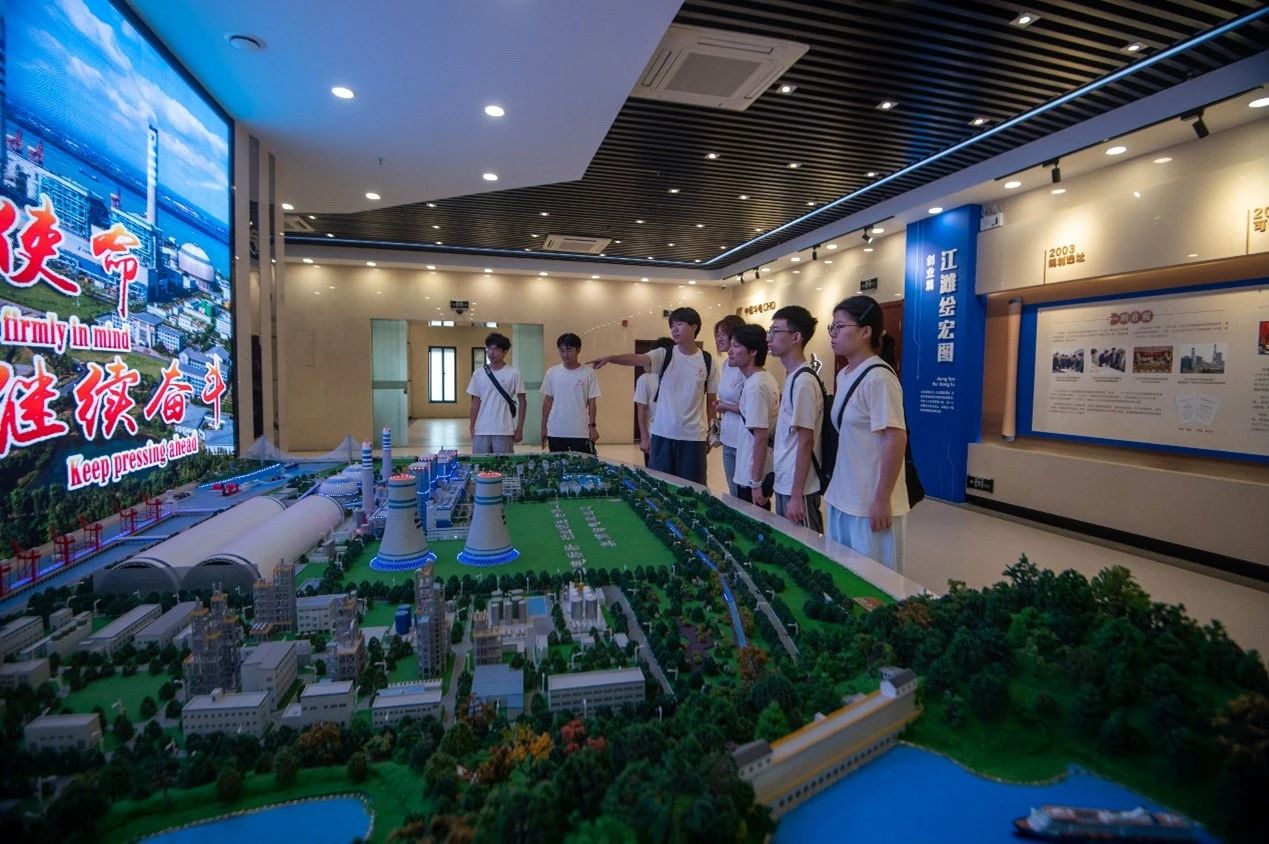 实践队于上午到达句容电厂,队员们首先前往厂史馆,在讲解员的引导下,了解句容发电厂的发展史。江苏句容电厂的建设始于2006年,2010年正式投产。在建设过程中,江苏句容电厂充分发挥了华电江苏能源的技术和管理优势,采用了先进的发电设备和技术,统筹兼顾了安全生产与高效运行。观看电厂整体模型之际,队员们无不为其规模之大、设计之巧而赞叹。这座电厂占地广阔,设备齐全,以燃煤发电为主,光伏发电为辅,共铸句电高能电厂之魂。