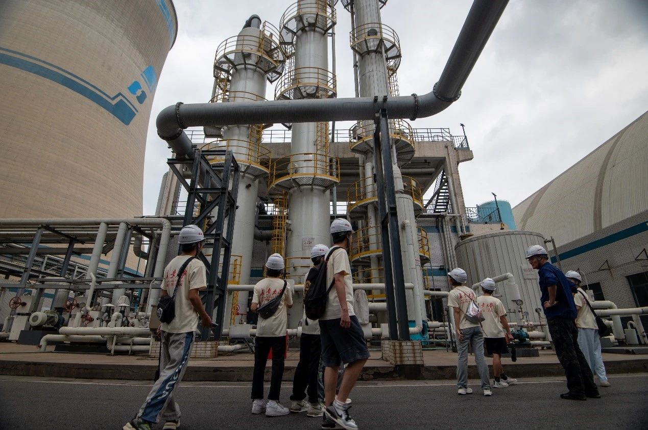 紧接着,实践队员们参观了句电公司碳捕集项目,它坐落于二期吸收塔对面,该项目是国内首台百万机组脱碳示范工程。此外,队员们还了解到,句电与清华大学有合作科技项目两项,一是国内首套针对火电机组碳捕集的仿真优化系统,二是二氧化碳催化转化制甲醇示范装置,实现了二氧化碳连续转化生产甲醇的行业技术示范。此外,电厂还建立了完善的废水处理系统和垃圾处理系统,确保了环境的清洁和整洁,切实落实习近平总书记“绿水青山就是金山银山”的要求。从最初的蒸汽机到如今的高效清洁能源利用,人类一直在不断探索和创新。这次对碳捕集项目的学习也让队员们更加期待未来的能源发展方向,相信会有更多绿色、智能的解决方案出现。