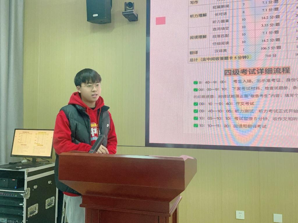 四六级考试是许多大学生都要面临的重要关卡,为了帮助同学们更好地应对下周即将到来的四六级考试,买球官方网站学生会邀请两位四六级成绩优异的学长肖睿和詹栩轩,于12月5日晚8点在扶轮大厦612会议室为同学们带来了一场干货满满的四六级经验分享会。