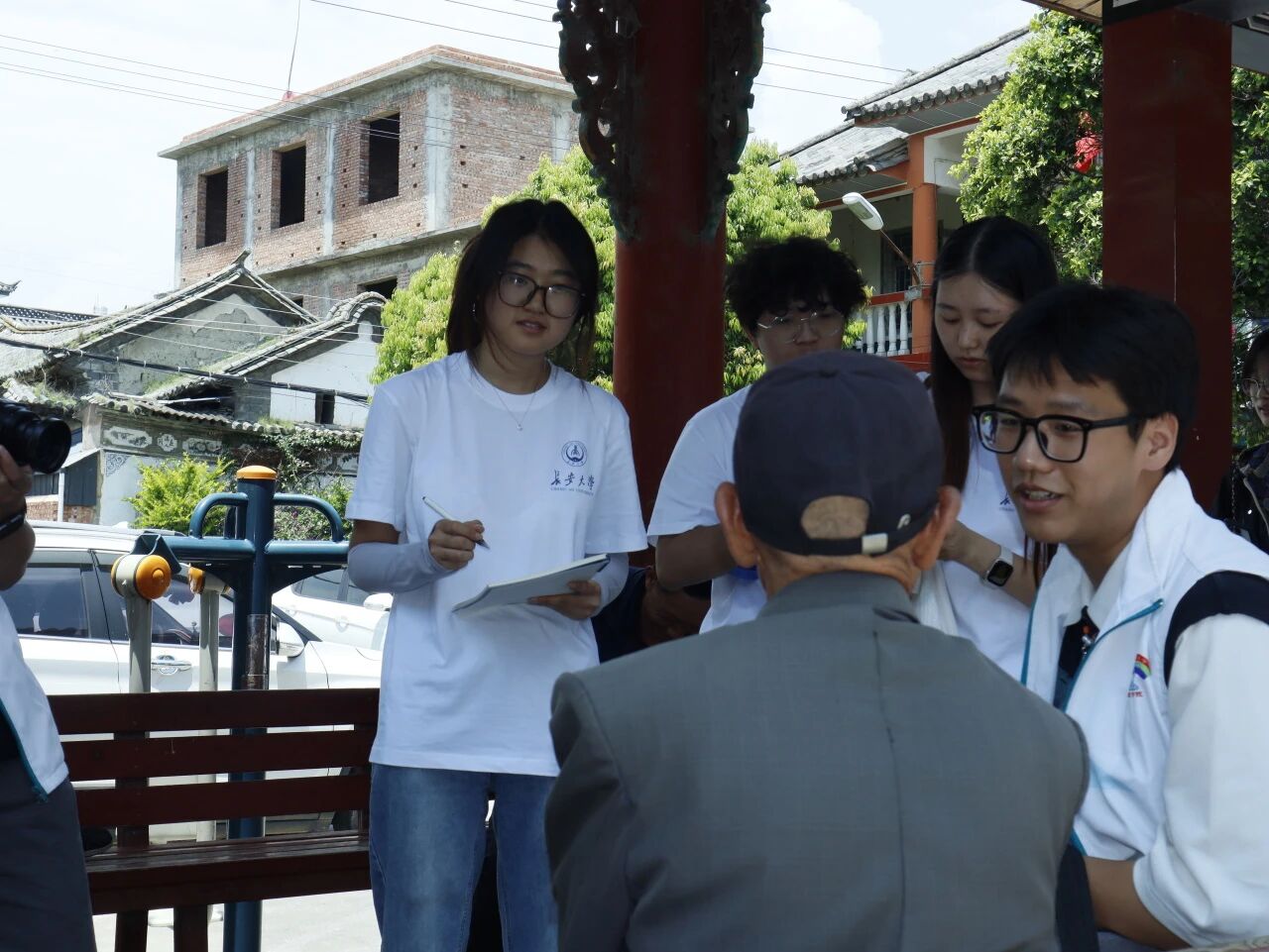 实践队首站抵达大理湾桥镇古生村,采用“推普+调研”双轨并行模式,深入农户和街头巷尾,贴近基层群众。队员们广泛选取各年龄层样本,完成了逾百份问卷,为后续工作奠定坚实数据基础。在古生村,队员们重点访谈了当地村民,热情的白族居民还向队员们教授了“祝你身体健康”“你好”等日常用语的本族语言。随后,调研足迹延展至北登村与向阳溪村。通过与村民、村干部的深度交流,团队捕捉到关键信息:年轻一代普遍具备基础普通话能力,中老年群体及学前儿童仍是推普重点;村民积极支持推普,渴望提升语言技能,同时对白族语言传承深怀忧虑。向阳溪村干部指出,得益于返乡务工者与乡村旅游业发展,村民普通话水平已有显著提升。