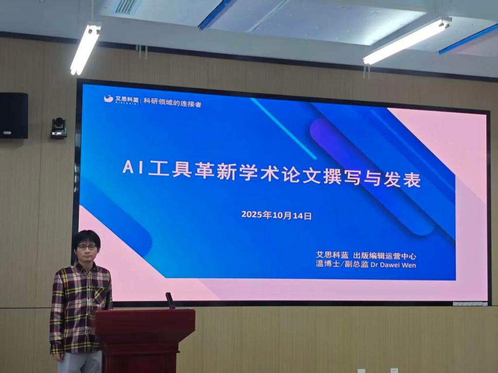 为积极响应国家关于人工智能赋能教育发展的战略部署,引导师生科学、高效地运用智能工具,10月14日,买球官网成功举办了以“AI工具革新学术论文撰写与发表”为主题的讲座。本次讲座特邀艾思科蓝出版编辑部温大尉总监担任主讲,吸引了众多师生踊跃参与。