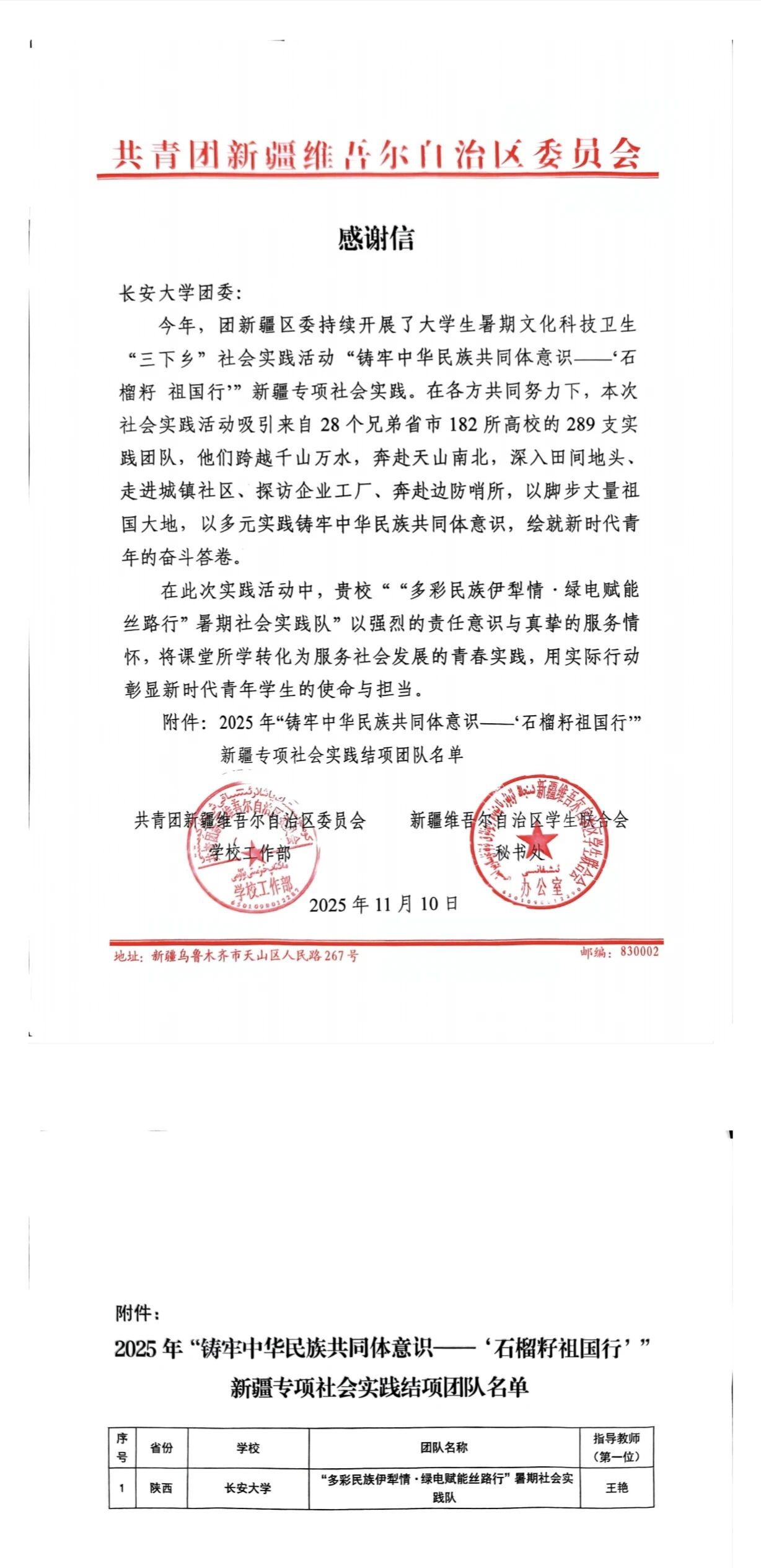 近日,共青团新疆维吾尔自治区委员会向买球官网实践队发来感谢信,对买球官网“多彩民族伊犁情·绿电赋能丝路行”社会实践队在2025年大学生暑期文化科技卫生“三下乡”社会实践活动“铸牢中华民族共同体意识—‘石榴籽 祖国行’”新疆专项社会实践中作出的积极贡献予以表扬和感谢!