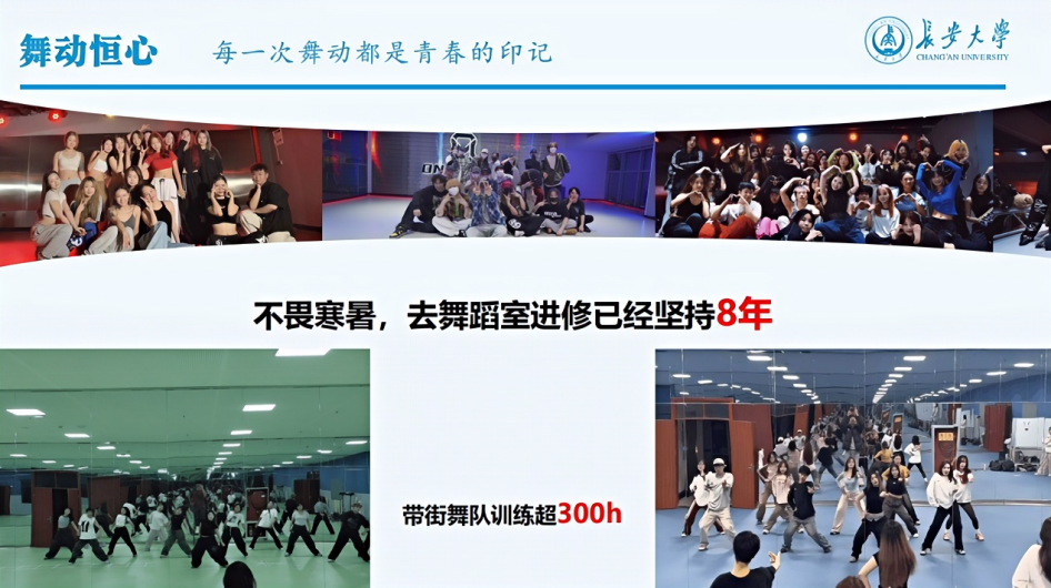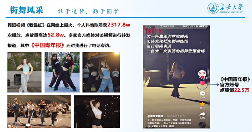 街舞是一种运动,更代表了一种精神。2023年军训期间,王睿涵作为街舞队队长带领队员们赴公路学院、汽车学院、电控学院、地测学院、理学院、运输学院、买球官方网站、外国语学院等11个学院进行慰问表演。在此过程中,王睿涵的《我最红》舞蹈表演视频在网络上爆火,在抖音平台获2317.8w次播放,点赞量高达52.8w。多家官方媒体对该视频进行转发报道,其中《中国青年报》还对王睿涵进行了电话专访,赞扬了其充满活力与激情的精彩表演和敢于追梦、勤于圆梦的优秀品质。