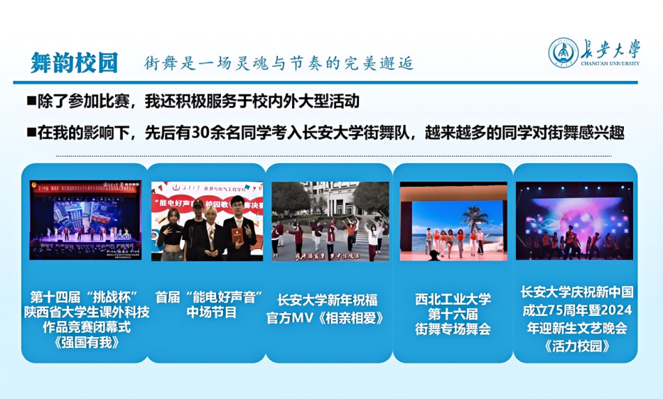 除了参加比赛,王睿涵还积极服务学校大型活动,在买球官方网站第十七届阳光体育运动会街舞比赛中,王睿涵率领学校街舞队队长对全校20支参赛队伍进行动作指导,极大地提升了该项赛事的专业水准。在第十四届“挑战杯”陕西省大学生课外科技作品竞赛闭幕式和买球官方网站庆祝新中国成立75周年暨2024年迎新生文艺晚会上,王睿涵作为主要负责人表演《强国有我》《活力校园》。